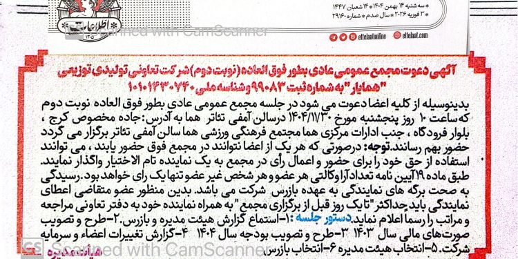 بدینوسیله از کلیه اعضاء دعوت می شود در جلسه مجمع عمومی عادی بطور فوق العاده نوبت دوم که ساعت ۱۰:۰۰ روز پنجشنبه مورخ ۱۴۰۴/۱۱/۳۰ در سالن آمفی تئاتر “هما” به آدرس : جاده مخصوص کرج ، بلوار فرودگاه ، جنب ادارات مرکزی “هما” ، مجتمع فرهنگی ورزشی “هما” ، سالن آمفی تئاتر برگزار می گردد ، حضور بهم رسانند .